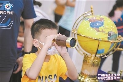 小學(xué)生使用望遠(yuǎn)鏡觀(guān)察物體。廣州科技活動(dòng)周主辦方供圖