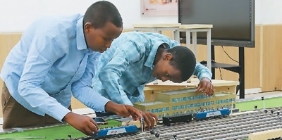 在位于吉布提首都吉布提市的吉布提工商學(xué)校,學(xué)生在魯班工坊鐵道運營沙盤教學(xué)區(qū)學(xué)習(xí)。 新華社發(fā) |