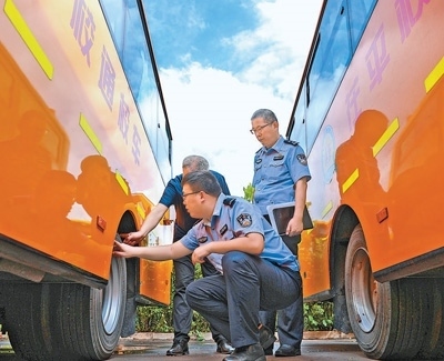 新學(xué)期開學(xué)在即,為保障學(xué)生乘車安全,各地組織開展校車安全專項(xiàng)檢查,對(duì)校車安全性能、司機(jī)駕駛資格以及隨車配備的安全應(yīng)急器材等進(jìn)行檢查,及時(shí)排除隱患。圖為8月27日,山東省聊城市茌平區(qū)交警在檢查溫陳街道的校車。