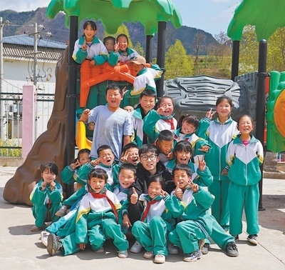 張鵬程和孩子們在課間活動時合影。受訪者供圖