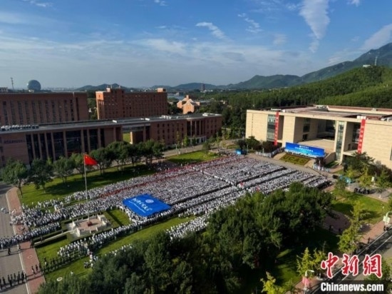 9月1日,國科大2024級新生開學典禮舉行,校園內(nèi)迎新氛圍濃郁,當日天氣晴好,可遠眺長城。中新網(wǎng)記者 孫自法 攝
