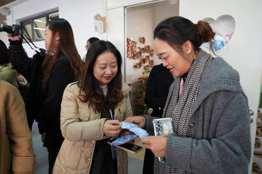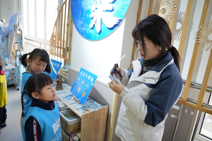 劉曉菲表示,利用幼兒園走廊寬的優(yōu)勢,把一樓打造成閱讀長廊,二樓藝術長廊,包括扎染、剪紙、造紙、拓印等非遺項目,三樓創(chuàng)造長廊,包括卡卡建構、炫彩建構、扭扭建構、墻釘游戲、機械探索等。