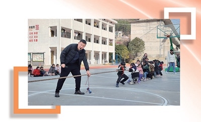 湖南省安化縣南金鄉(xiāng)將軍完小的操場(chǎng)上,龐曉曉(前排左一)組織學(xué)生們開展拔河比賽。