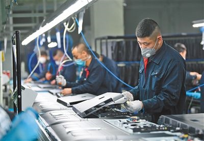 內(nèi)蒙古TCL光電科技有限公司員工正在生產(chǎn)線上組裝電視機(jī)。