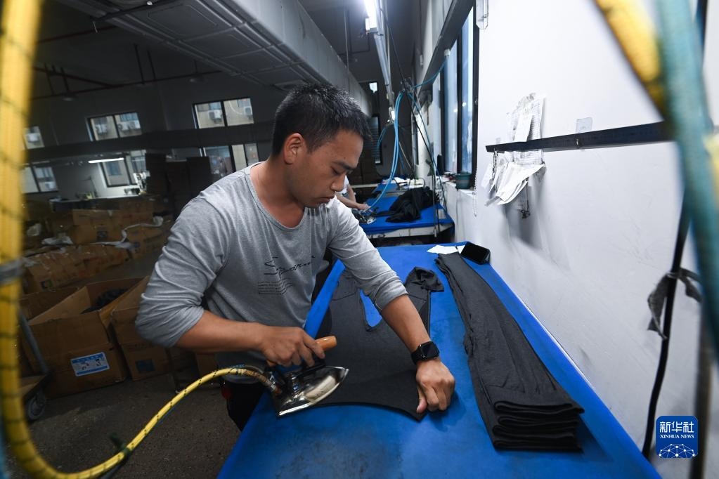 10月27日,在浙江省諸暨市大唐街道的一家專業(yè)生產拉絨打底褲產品的企業(yè)車間內,工作人員在加工拉絨打底褲。新華社記者 徐昱 攝