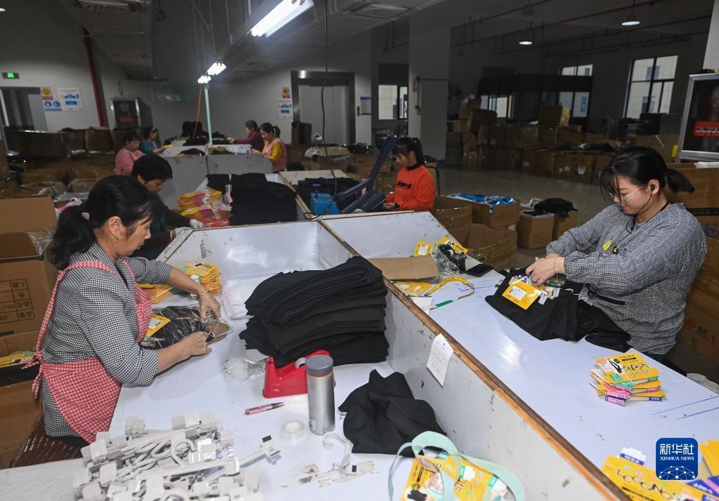 10月27日,在浙江省諸暨市大唐街道的一家企業(yè)車間內,工人在包裝保暖褲襪。新華社記者 徐昱 攝