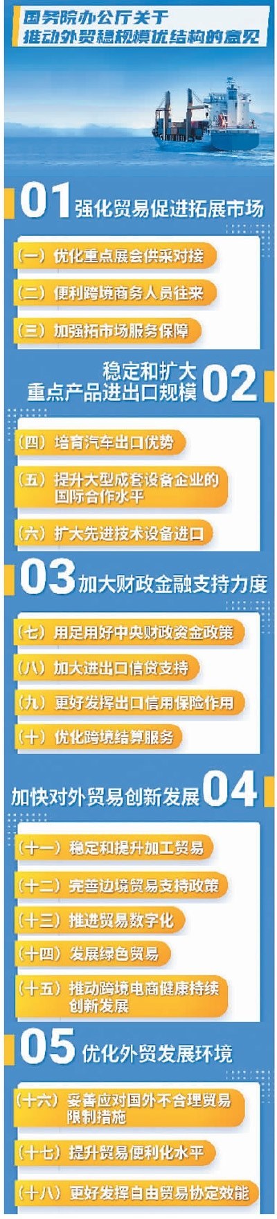 聚焦穩(wěn)規(guī)模,外貿(mào)“18條”突出創(chuàng)造貿(mào)易機會的同時,強調(diào)穩(wěn)定和擴大重點產(chǎn)品貿(mào)易。