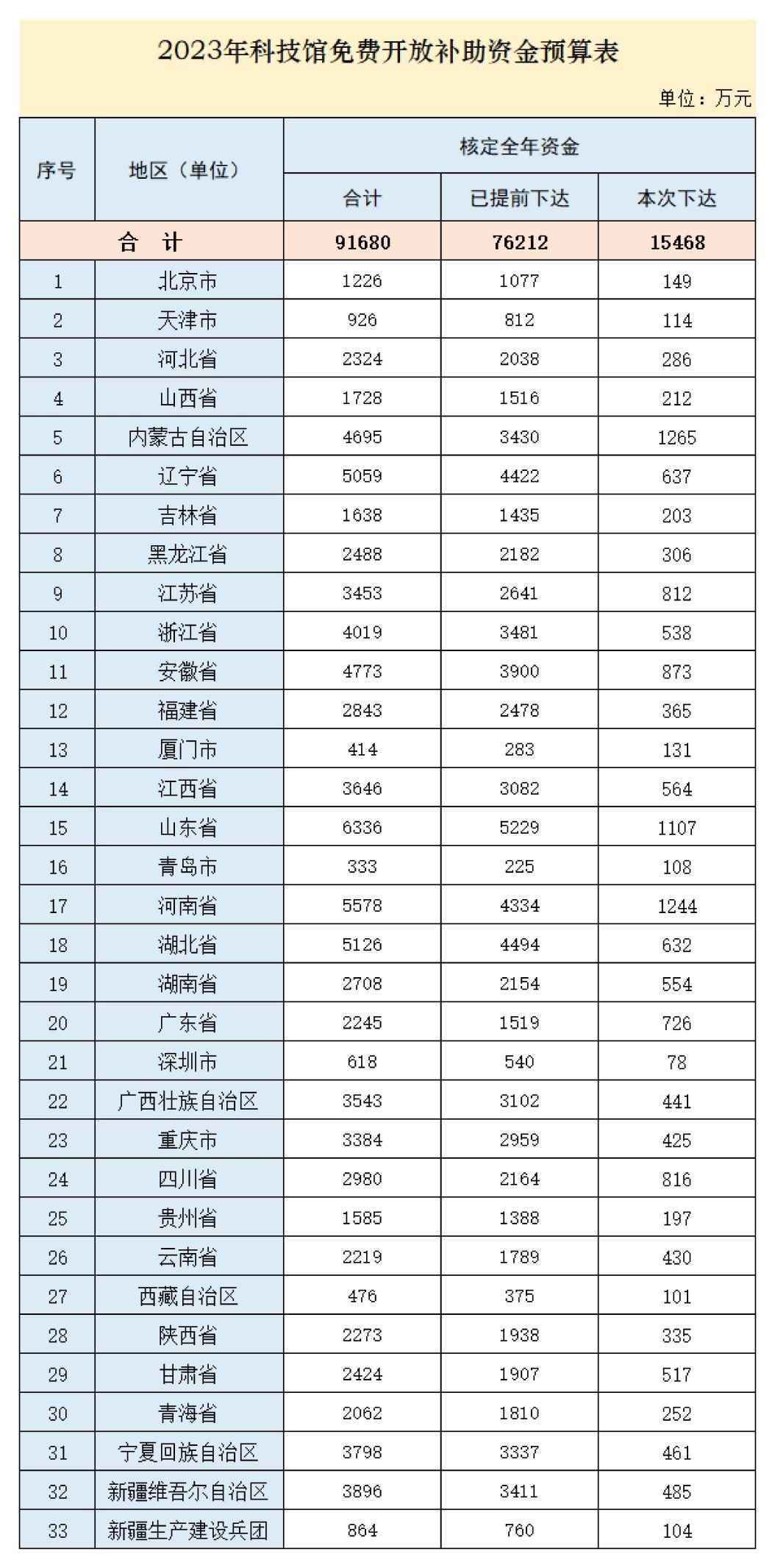 人民網(wǎng)北京5月10日電 (記者任妍)記者從財(cái)政部獲悉,為保障免費(fèi)開放科技館正常運(yùn)轉(zhuǎn),經(jīng)研究,現(xiàn)下達(dá)2023年科技館免費(fèi)開放補(bǔ)助資金預(yù)算,統(tǒng)籌用于各?。▍^(qū)、市)及新疆生產(chǎn)建設(shè)兵團(tuán)2023年免費(fèi)開放科技館門票減收補(bǔ)助、運(yùn)行保障增量補(bǔ)助及展品更新補(bǔ)助等方面。數(shù)據(jù)顯示,全國核定預(yù)算91680萬元,提前下達(dá)76212萬元,此次下達(dá)15468萬元。
