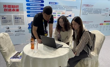 萬方數(shù)據(jù)工作人員現(xiàn)場為用戶進(jìn)行產(chǎn)品演示。(受訪者供圖)
