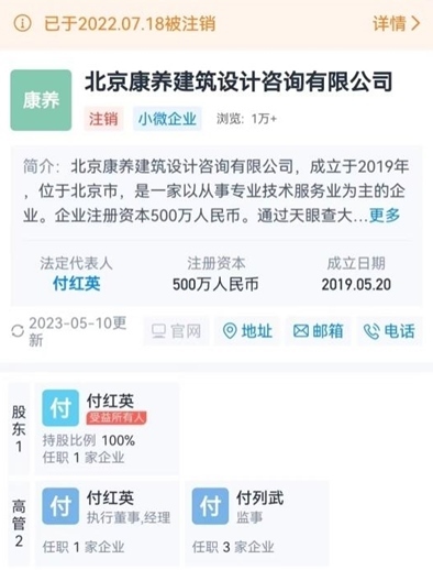 在付列武成為中冶吉信和康和信兩家公司一把手的一周之后,康和信就全資收購(gòu)了一家個(gè)人獨(dú)資企業(yè)北京康養(yǎng)建筑設(shè)計(jì)咨詢有限公司,被收購(gòu)的北京康養(yǎng)公司的監(jiān)事是付列武自己,法定代表人是付紅英,付紅英100%持股北京康養(yǎng)建筑設(shè)計(jì)咨詢有限公司。