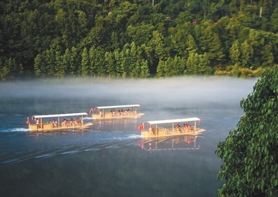 游客乘坐游船在新安江的江霧中前行。2012年浙皖兩省建立新安江流域生態(tài)補(bǔ)償機(jī)制試點(diǎn),新安江成為全國跨區(qū)域生態(tài)文明治理樣板。山水相連、河湖相通、生態(tài)相依,三省一市持續(xù)探索跨界治水、流域共治,筑牢生態(tài)基底、推動(dòng)綠色發(fā)展。新華社記者 徐 昱攝