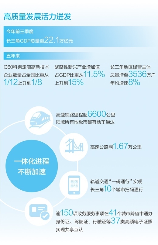 今年前三季度,長三角GDP總量逾22.1萬億元,占全國GDP總量比重較2022年同期有所提升,三省一市經(jīng)濟(jì)增速均超過了全國平均水平;作為長三角一體化發(fā)展國家戰(zhàn)略的先手棋和突破口,長三角生態(tài)綠色一體化發(fā)展示范區(qū)掛牌以來,共形成136項(xiàng)務(wù)實(shí)有效的制度創(chuàng)新成果,其中38項(xiàng)已面向全國復(fù)制推廣;已有逾150項(xiàng)政務(wù)服務(wù)事項(xiàng)可在長三角41個(gè)城市跨省市通辦,實(shí)現(xiàn)身份證、駕駛證、行駛證等37類高頻電子證照的共享互認(rèn)……