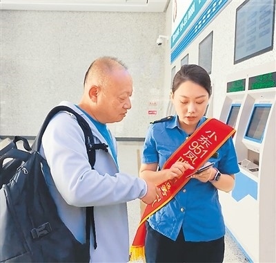 遼寧朝陽“小東951·鳳鳴朝陽”服務(wù)團(tuán)隊成員幫助旅客使用手機(jī)12306APP購票。沈陽局供圖
