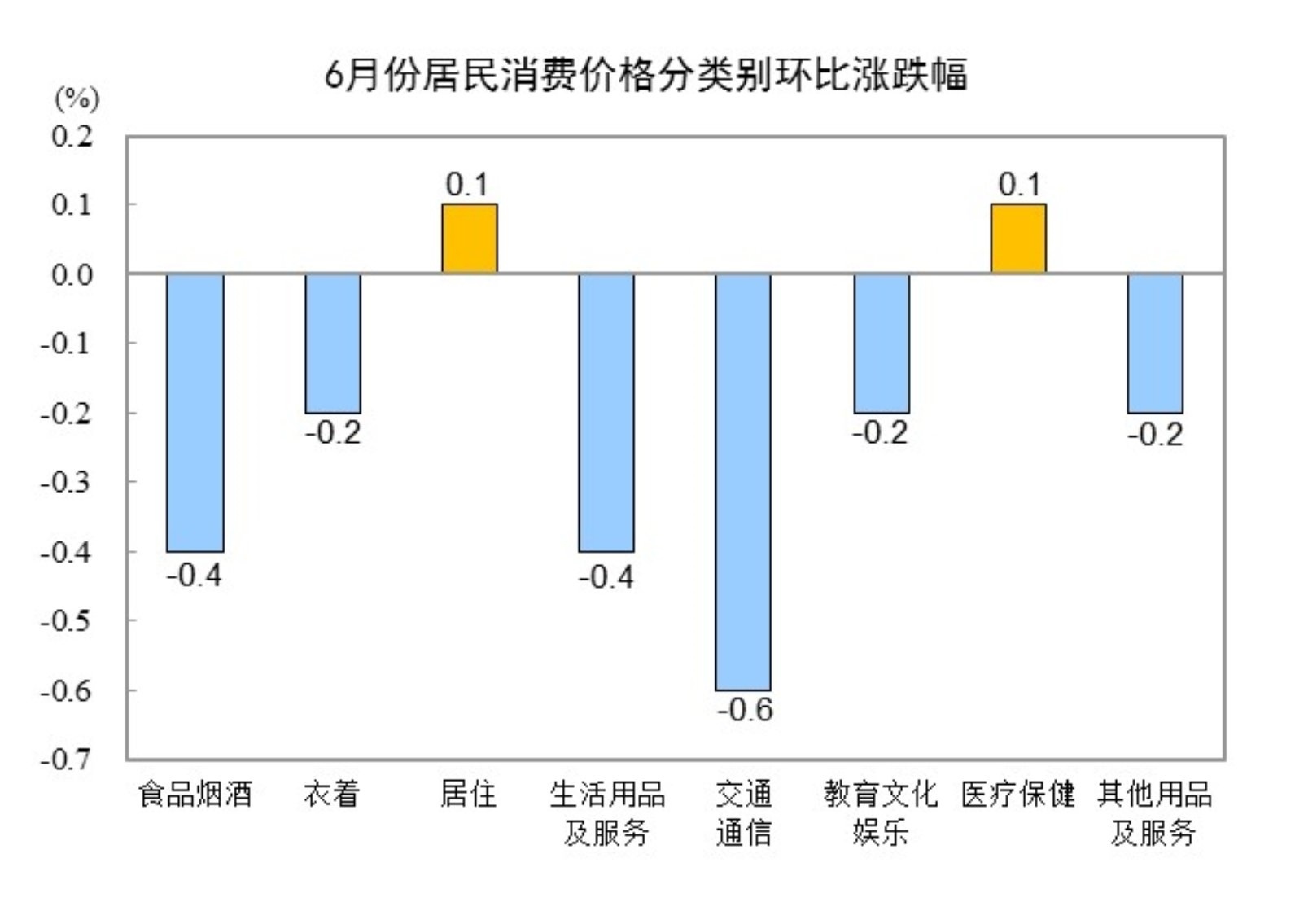 6月份,全國居民消費(fèi)價(jià)格環(huán)比下降0.2%。其中,城市下降0.2%,農(nóng)村下降0.2%;食品價(jià)格下降0.6%,非食品價(jià)格下降0.2%;消費(fèi)品價(jià)格下降0.4%,服務(wù)價(jià)格持平。