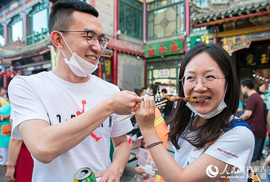 游客在呼和浩特市大召景區(qū)品嘗內(nèi)蒙古美食。丁根厚 攝