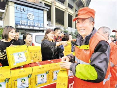 領(lǐng)到月餅的環(huán)衛(wèi)工人喜笑顏開 攝影/梁良
