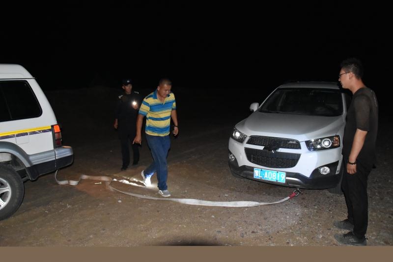 正當(dāng)二人漸漸失去希望的時(shí)候,當(dāng)晚10點(diǎn)10分,遠(yuǎn)處一道燈光閃過(guò),原來(lái),阿拉善邊境管理支隊(duì)溫圖高勒邊境派出所民警下鄉(xiāng)走訪正好路過(guò)。得知二人情況后,民警立即展開(kāi)救援,一路迅速找出隨身攜帶的干糧、礦泉水為二人補(bǔ)充體力,一路找出牽引繩對(duì)被困車(chē)輛開(kāi)展救援,經(jīng)過(guò)6個(gè)小時(shí)的拖拽,終于在凌晨4點(diǎn)將兩名群眾安全帶到了派出所。