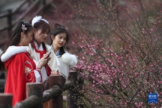 當日,西塞山第五屆梅花節(jié)在浙江省湖州市吳興西塞山旅游度假區(qū)原鄉(xiāng)小鎮(zhèn)景區(qū)開幕,盛開的梅花吸引不少游客前來觀賞。