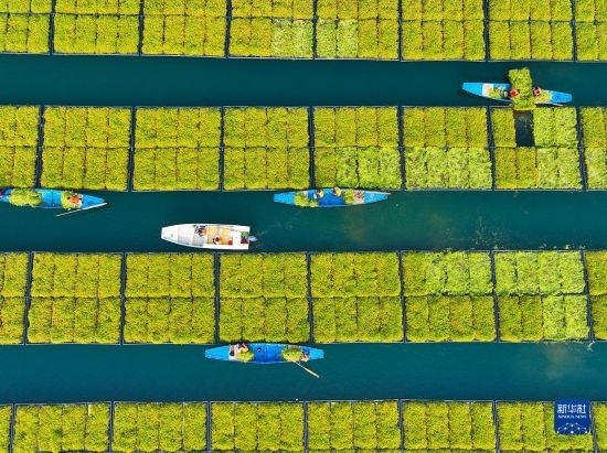2月17日,浙江省杭州市淳安縣千島湖鎮(zhèn)坪山生態(tài)浮島上,工作人員忙著采摘水生蔬菜(無人機(jī)照片)。