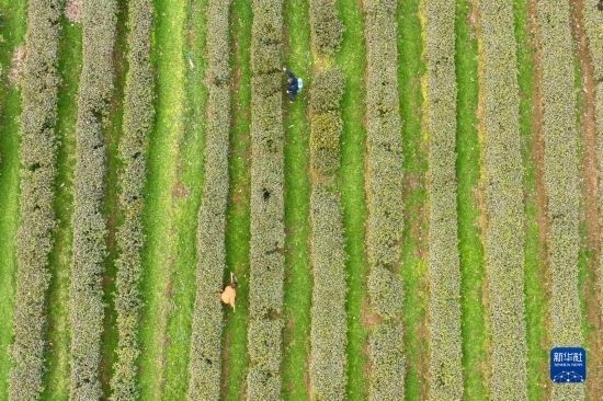 2月17日,茶農(nóng)在湖北省丹江口市土關(guān)埡村武當(dāng)茶谷勞作(無人機(jī)照片)。