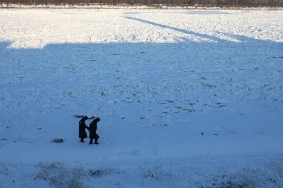 “慢點(diǎn)走,這雪地看著平整,下面還有一層冰?!笔废葟?qiáng)一邊說一邊攙著沈欣慢慢走。沿著江堤一路下坡,走到頭就是黑龍江,江面中間插著國旗標(biāo)識國界。