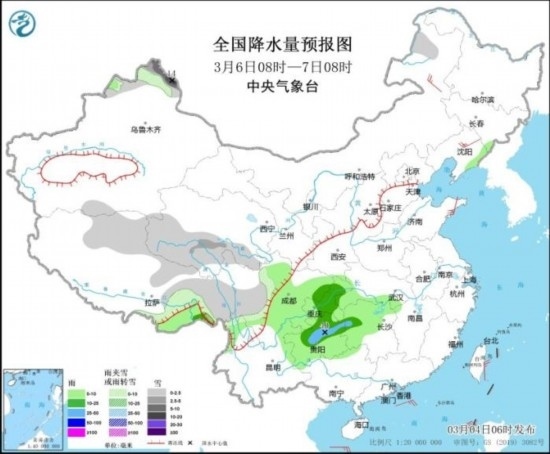 3月6日08時至7日08時,新疆北疆北部、內蒙古東北部、西藏北部和東部、青海南部、川西高原大部等地部分地區(qū)有小到中雪或雨夾雪,其中,新疆阿勒泰等地局地有大到暴雪(10~14毫米)。云南東北部、四川中東部、重慶、湖北南部、貴州、湖南中北部等地部分地區(qū)有小到中雨,其中,湖南西部、貴州中部等地局地有大雨(25~40毫米)。內蒙古東北部、山東半島等地部分地區(qū)有4~6級風。臺灣海峽、巴士海峽、南海大部海域將有6~7級風。