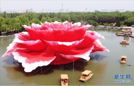 近日,在河南省洛陽(yáng)市隋唐城遺址植物園,一座直徑36米、高13米的巨型牡丹景觀造型亮相滴翠湖,吸引游客前來(lái)觀賞。