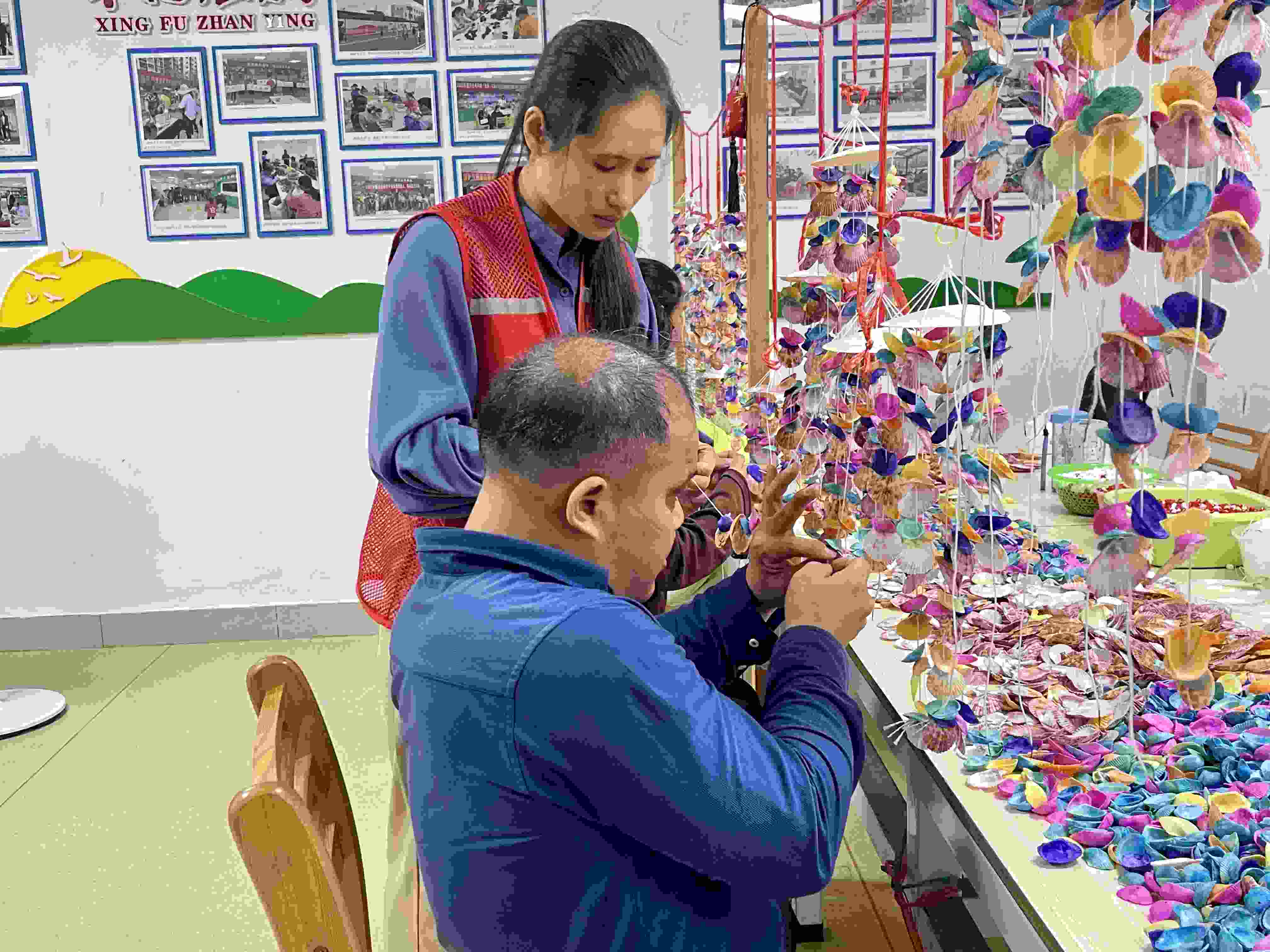 工作人員在教殘疾人張清氧串貝殼,雖然動(dòng)作還略顯遲鈍,但他一直在耐心學(xué)習(xí),“我每天騎三輪車上下班,在這里工作很開(kāi)心,可以自己賺到錢了?!?/p>