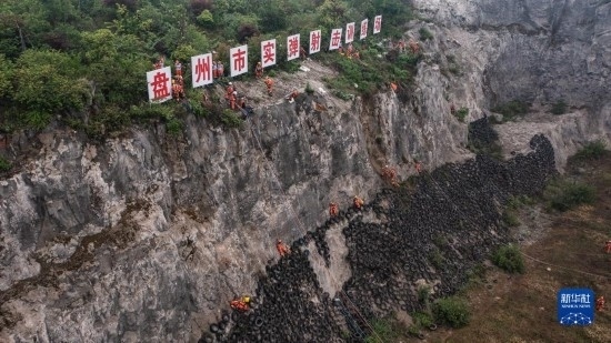六盤水消防救援支隊隊員在進行模擬高山峽谷救援演練(5月11日攝,無人機照片)。