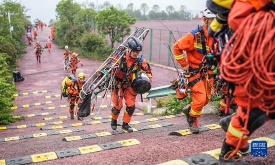 消防救援人員背負裝備前往演練場地(5月11日攝)。