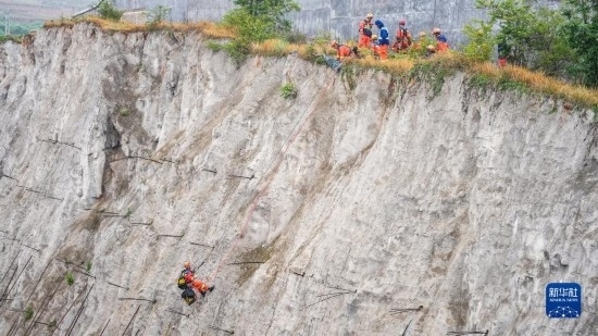 消防救援人員在進行模擬山體垮塌救援演練(5月11日攝,無人機照片)。