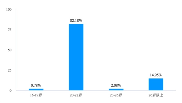同樣,由于需要一天內(nèi)打卡多個甚至十幾個景點(diǎn)、為了節(jié)省成本而大量采取步行和騎行的“特種兵旅游”需要大量體力,因此集中在年輕人群,調(diào)查結(jié)果顯示有82.18%受訪者年齡段集中在20~22歲,可見大學(xué)生人群是對“特種兵旅游”感興趣和參與的主力。