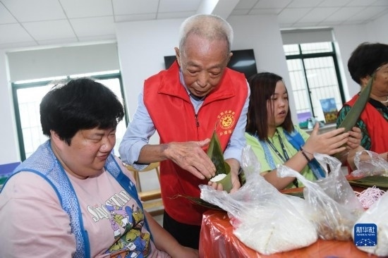 5月29日,在湖州市環(huán)渚街道玉堂橋社區(qū)組織的迎端午活動中,凌法林(左二)和其他志愿者一起指導殘障人士包粽子。
