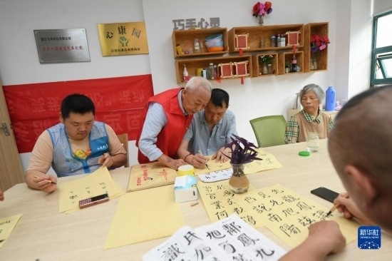 5月29日,在湖州市環(huán)渚街道玉堂橋社區(qū),凌法林(左二)指導殘障人士練習書法。