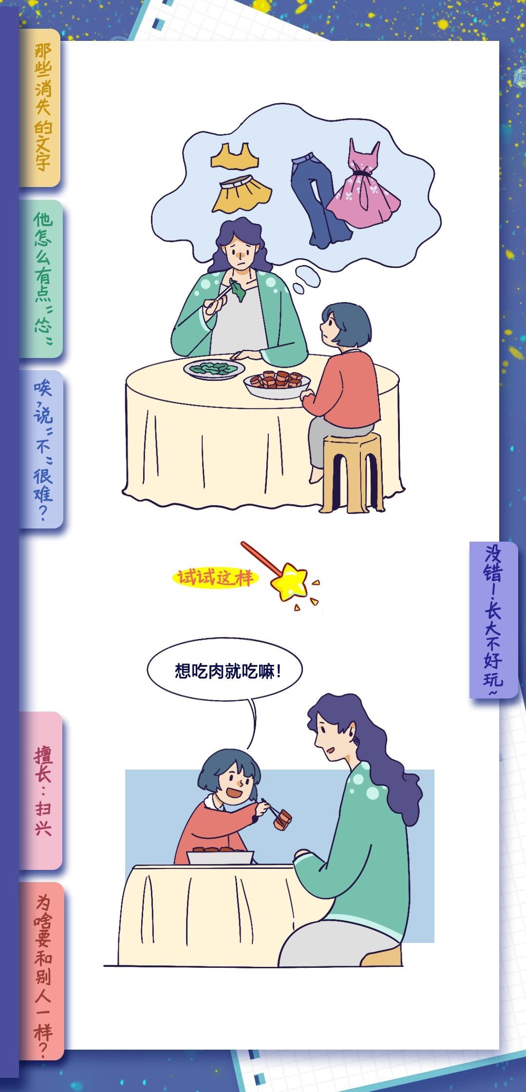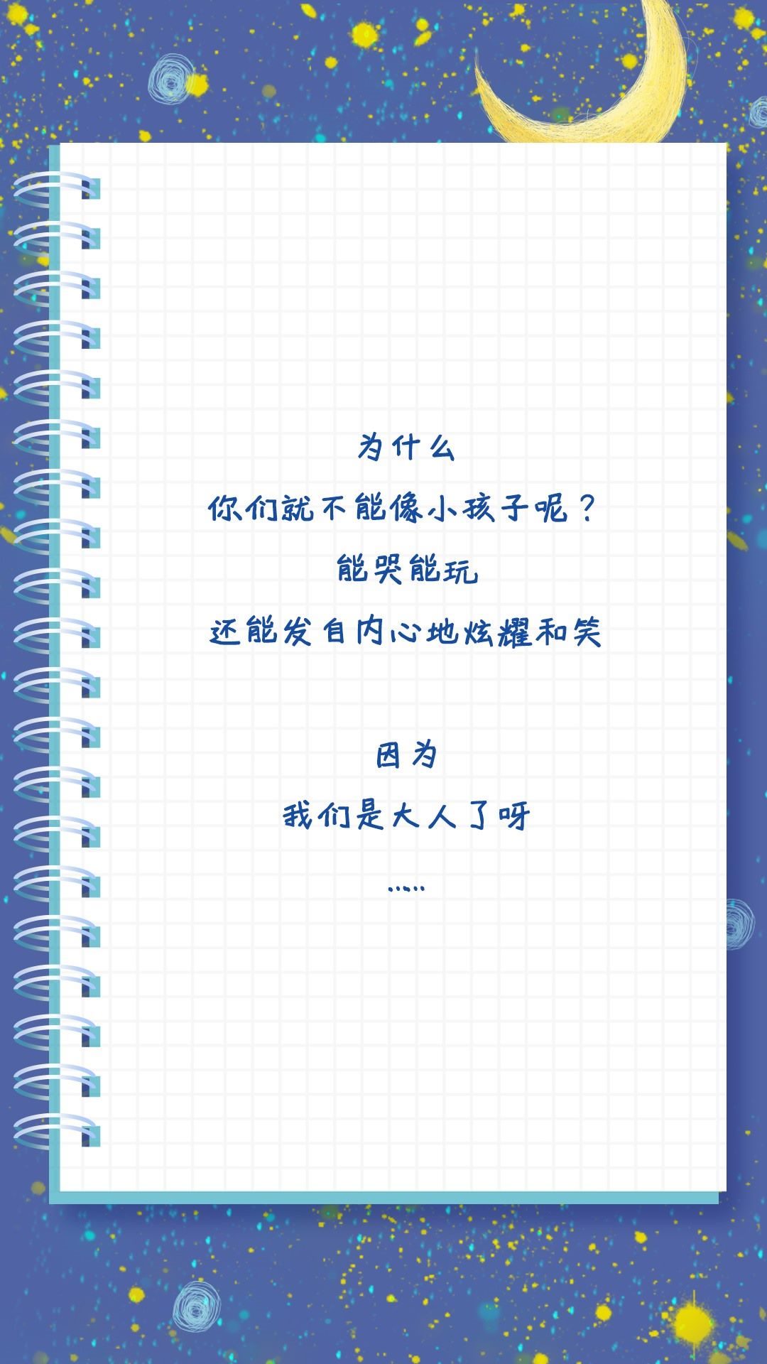 也許是不做小孩的時(shí)間太長(zhǎng)了吧,長(zhǎng)到讓我們忘了做小孩是什么感覺(jué)?,F(xiàn)實(shí)世界推著你長(zhǎng)大,有多少次仰望星空,想回到童年,體會(huì)簡(jiǎn)單的快樂(lè)。拒絕做無(wú)聊大人,釋放內(nèi)心的“小孩”,親愛(ài)的大人,請(qǐng)好好做自己吧!祝每一位“大朋友”節(jié)日快樂(lè)!