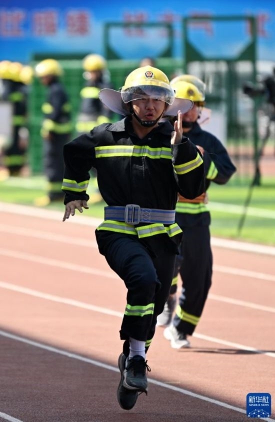 6月2日,大學(xué)生代表參加身穿消防服100米跑趣味消防運動比賽。