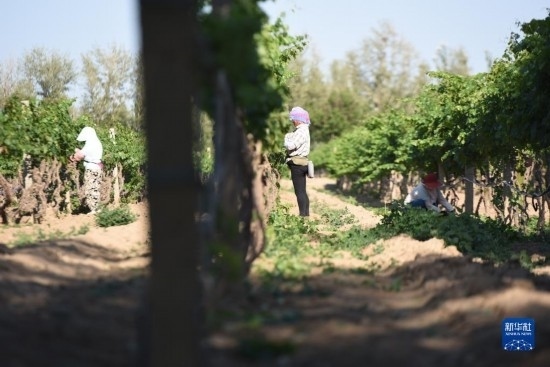 6月21日,在河北省懷來縣長城桑干酒莊葡萄種植基地,當(dāng)?shù)剞r(nóng)民在田間勞作。