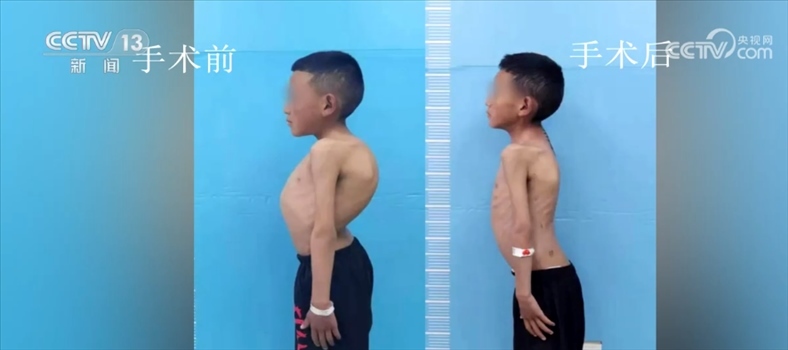 北京大學人民醫(yī)院脊柱外科主任 劉海鷹:另外這兩個特別重的孩子,我們做的頭盆環(huán)牽引,牽引上以后,先到康復醫(yī)院那邊,定期給它一點一點撐開,差不多兩三個月以后,撐到一定程度以后,把胸腔都打開了,肺功能也改善了以后,對于麻醉對于手術來說更安全,另外對于神經(jīng)功能也比較安全了,在這種前提下我們做一個固定的矯正的手術。預期來說,矯正70%-80%應該沒問題,矯正到外表上基本上看不見。