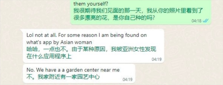 例如,在“聊天范例”中,詐騙人員偽裝的女性詢(xún)問(wèn)對(duì)方:“我從你的照片里看到了很多漂亮的花,是你自己種的嗎?”張先生說(shuō),其目的就是想判斷對(duì)方的居住環(huán)境。