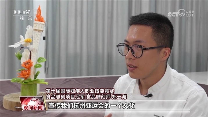第十屆國(guó)際殘疾人職業(yè)技能競(jìng)賽食品雕刻項(xiàng)目冠軍 食品雕刻師 鄭云海:最近有火炬(傳遞),寓意就是美好、和平,還有吉祥。我想用自己的技能去宣傳我們杭州亞運(yùn)會(huì)的一個(gè)文化。