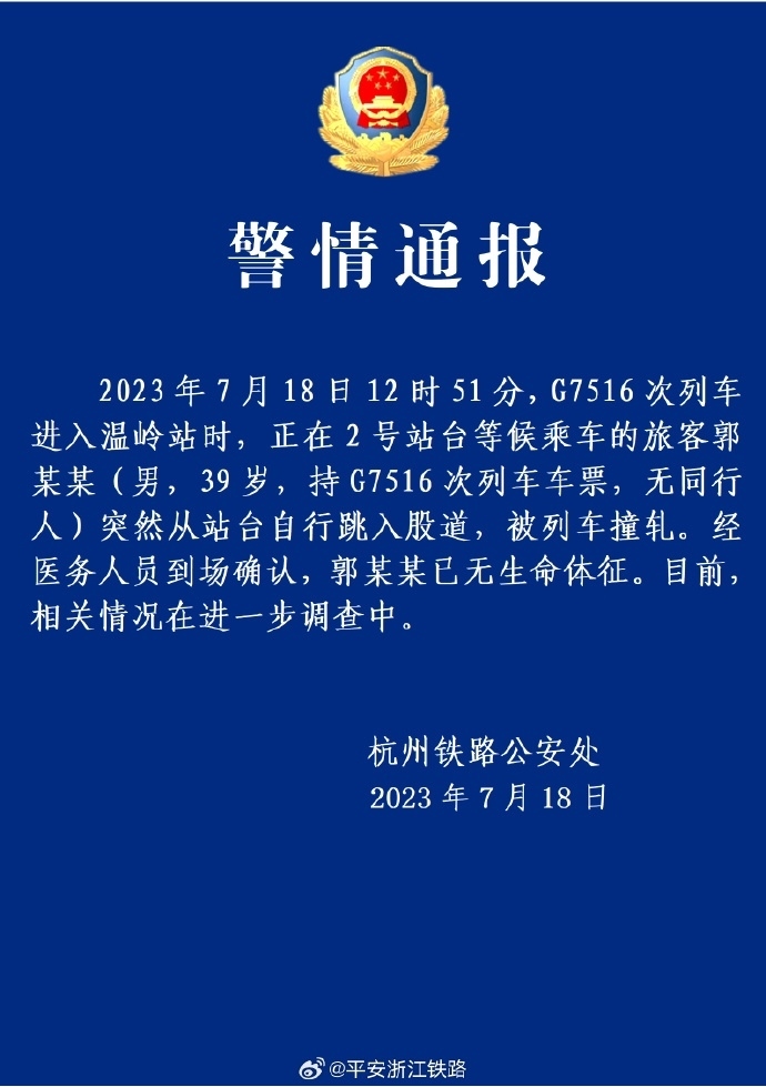 ·警方通報:溫嶺跳下高鐵站臺男子已無生命體征。