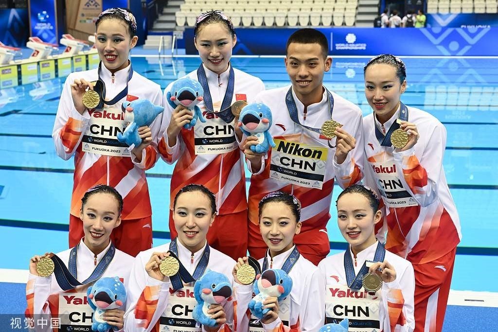 7月17日,2023年福岡游泳世錦賽,石浩玙(后排右二)隨中國隊拿下花游集體技巧自選項目金牌。