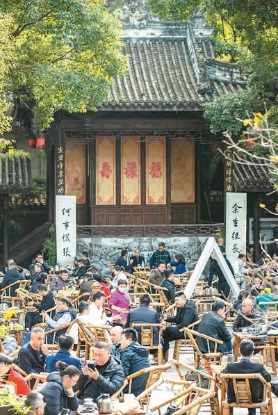 人們?cè)诔啥艰F像寺水街的陳錦茶鋪喝茶。新華社記者 沈伯韓攝