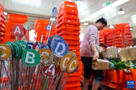 一名工作人員在昆明國際花卉拍賣交易中心內(nèi)對(duì)臺(tái)車上存放的鮮花進(jìn)行掃碼(7月13日攝)。新華社記者 陳欣波 攝