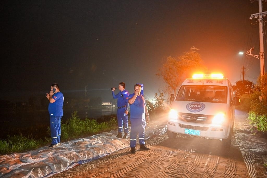 8月4日,在大清河天津靜海段北堤,天津靜海藍天救援隊隊員夜間巡堤時發(fā)現(xiàn)隱患點后,通過燈光指引和對講機呼話,與南堤隊員協(xié)同處理。新華社記者 孫凡越 攝