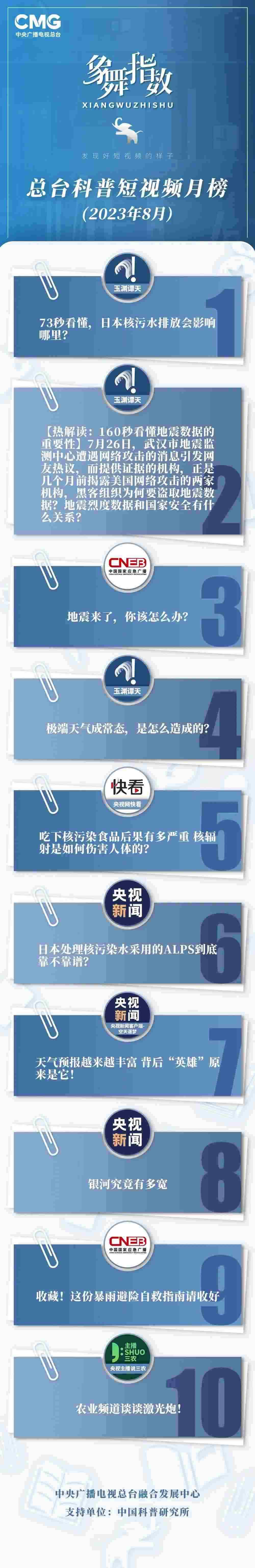 中央廣播電視總臺“象舞指數(shù)”評議品牌,推出科普短視頻月榜、總臺科普短視頻月榜。在2023年8月,值得注目的內(nèi)容有: