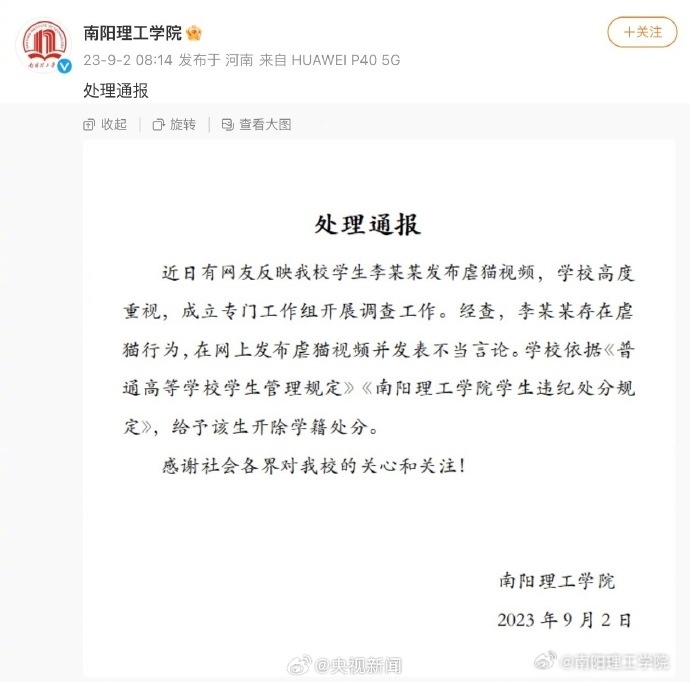 ·南陽理工學(xué)院再通報:對涉事虐貓學(xué)生給予開除學(xué)籍處分。