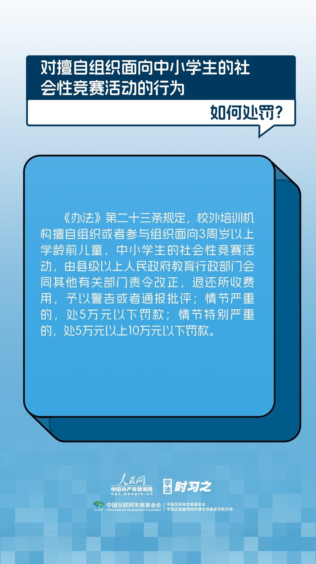 《校外培訓行政處罰暫行辦法》(以下簡稱《辦法》)將于2023年10月15日起施行?!掇k法》提出了校外培訓行政處罰總體要求。規(guī)定適用對象為面向社會招收3周歲以上學齡前兒童、中小學生,違法開展校外培訓的自然人、法人或者其他組織。要求校外培訓行政處罰應當遵循公正、公開的原則,堅持處罰與教育相結合,引導自然人、法人或者其他組織自覺守法,共同抵制校外培訓違法行為,營造有利于學生成長成才的良好環(huán)境。