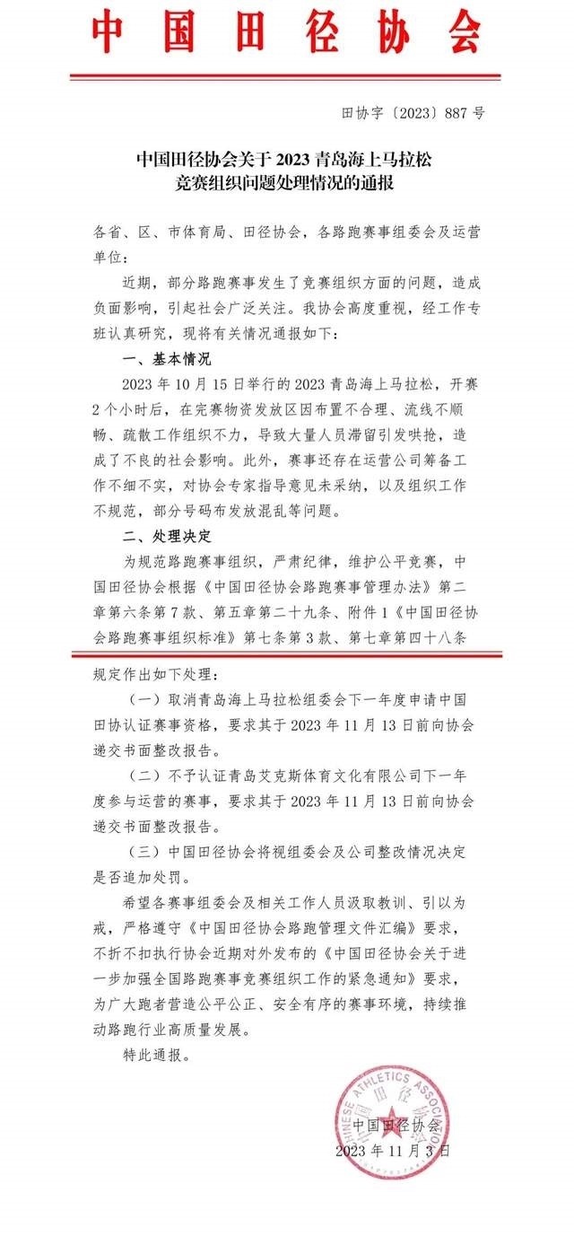 央視網(wǎng)消息:據(jù)“中國(guó)馬拉松平臺(tái)”官微消息,近日,部分路跑賽事出現(xiàn)了一些競(jìng)賽組織問題,引發(fā)社會(huì)廣泛關(guān)注,造成了不良的社會(huì)影響。中國(guó)田徑協(xié)會(huì)高度重視、全面調(diào)查,依據(jù)事實(shí)和路跑賽事管理規(guī)定,從加強(qiáng)競(jìng)賽組織,壓實(shí)各方主體責(zé)任,提示行業(yè)風(fēng)險(xiǎn)隱患的角度,對(duì)相關(guān)單位和人員進(jìn)行了相應(yīng)處理。現(xiàn)將處理情況通報(bào)如下:
