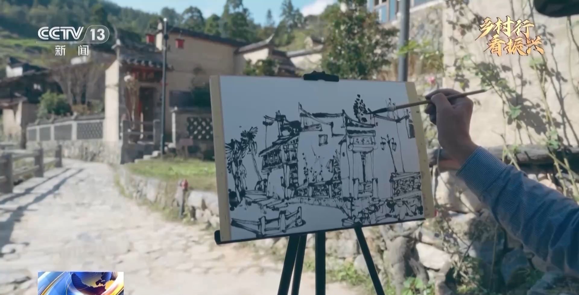 總臺記者 林姍蓉:這里就是龍?zhí)洞?。沿著溪水一路往下,你可以看到兩岸都是這種高低錯落的土夯的民居。這個季節(jié)柿子都熟了,到處都可以看到村民曬柿餅、曬稻谷,黃綠交錯的,非常好看。來到龍?zhí)叮€有一點(diǎn)非常讓我印象深刻,就是在這里每走幾步,我都可以看到一個正在寫生創(chuàng)作的藝術(shù)家。